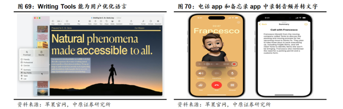 苹果于2024年10月发布面向iPhone、iPad和Mac的个人智能化系统苹果智能(Apple Intelligence),基于个人场景发挥生成式模型的强大功用,结合用户情况提供有助益且相关的智能化功能。苹果智能充分运用苹果芯片对语言和图像的理解与创作能力,可做出多种跨app操作,同时结合个人场景,为用户简化和加快日常任务流程。