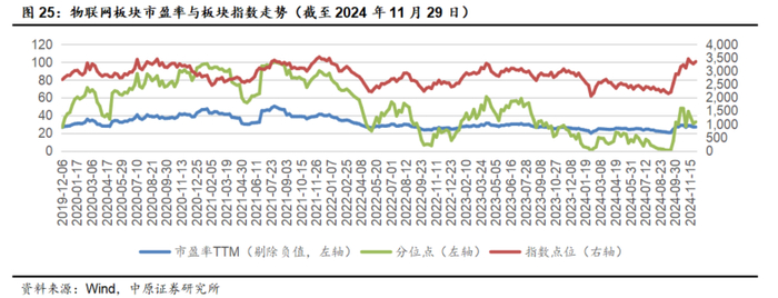 截至2024年11月29日,物联网板块PE-TTM(剔除负值)为27.2X,处于近5年32.7%分位,近10年27.1%分位。物联网模组行业受车路云协同和算力浪潮驱动,叠加下游全面复苏,预计基本面边际向好,有望继续实现业绩和估值修复。