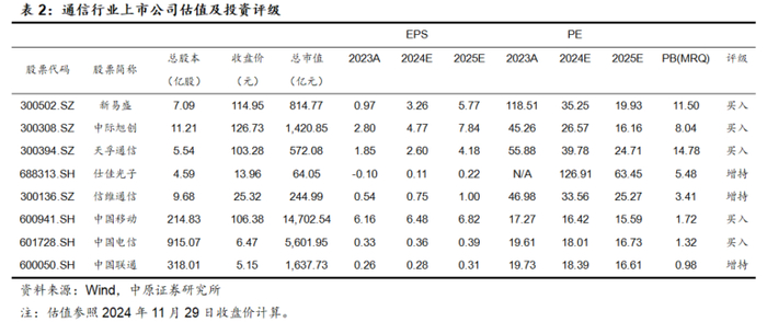 投资建议:当前通信行业估值中枢处于历史平均偏下水平,考虑行业业绩增长预期及估值水平,维持行业“同步大市”投资评级。光模块/光器件建议关注新易盛(300502)、中际旭创(300308)、天孚通信(300394);光芯片建议关注仕佳光子(688313);消费电子零部件建议关注信维通信(300136);电信运营商建议关注中国移动(600941)、中国电信(601728)、中国联通(600050)。