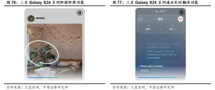 三星Galaxy S24系列手机搭载AI大模型Galaxy AI,该大模型功能为系统级集成,可在通话、笔记、系统相册等界面中调出。Galaxy S24系列的通话实时翻译能够在通话过程中提供实时的语音和文字翻译功能,支持13种不同语言,并且基于完全离线的AI功能而实现,使用过程中无需将用户的通话内容传至云端,因此能够更好地确保通话隐私。转录助手能够将会议或讲话内容实时转录为文字,并可智能区分不同的发言者,转录成文本内容之后还可智能整理要点。笔记助手能够智能生成摘要和封面,让用户更容易整理和查找笔记。Galaxy S24系列提供AI图生图等创意功能,生成式AI功能可以在用户编辑照片时智能补全画面背景,让用户自主调整画面的角度,或移动、删除、缩放画面中的某个对象。此外,Galaxy S24系列首创即圈即搜,该功能深植于操作系统当中,让智能手机的搜索体验更便捷和人性化。