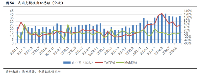 我国光模块出口总额同比保持高速增长。2024年10月,我国光模块出口总额为37.7亿元,同比增长48.3%,环比增长4.5%;2024年1-10月,光模块出口总额为364.6亿元,同比增长70.6%。我国作为光模块生产大国,海关数据的高增长印证AI驱动下的光模块行业高景气。