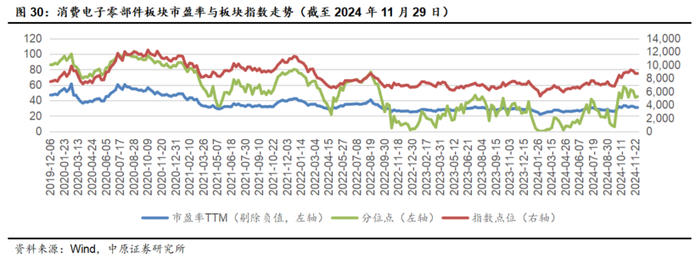 截至2024年11月29日,消费电子零部件板块PE-TTM(剔除负值)为31.4X,处于近5年45.1%分位,近10年33.7%分位。