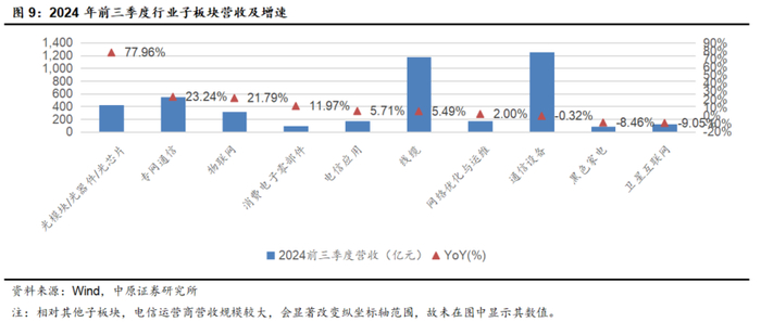 2024年前三季度,营收同比增速前三的子板块分别为:光模块/光器件/光芯片(419.40亿元,+77.96%)、专网通信(552.46亿元,+23.24%)、物联网(317.89亿元,+21.79%);营收同比增速后三位的子板块分别为:卫星互联网(127.70亿元,-9.05%)、黑色家电(86.29亿元,-8.46%)、通信设备(1257.61亿元,-0.32%)。