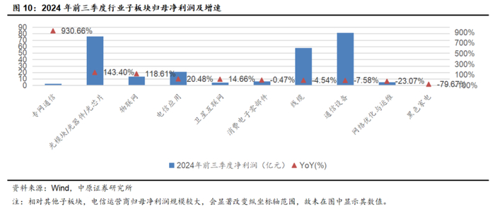 2024年前三季度,归母净利润同比增速前三的子板块分别为专网通信(2.55亿元,+930.66%)、光模块/光器件/光芯片(75.74亿元,+143.40%)、物联网(13.95亿元,+118.61%);归母净利润同比增速后三位的子板块分别为:黑色家电(0.62亿元,-79.67%)、网络优化与运维(5.15亿元,-23.07%)、通信设备(81.44亿元,-7.58%)。