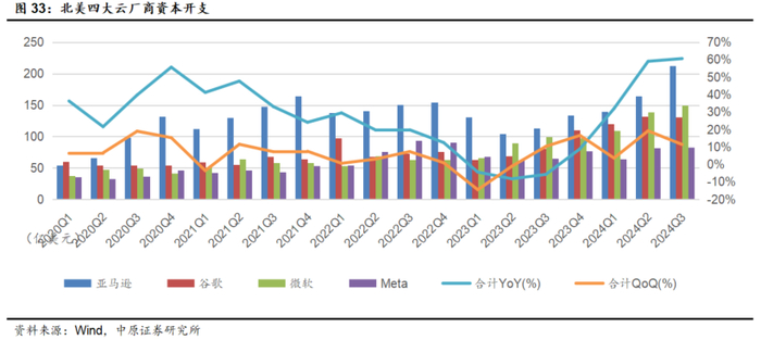 海外AI产业持续提速,在数据中心建设方面,北美四大云厂商2024年资本开支保持稳定增长,并且在技术基础设施方面的投入有所增加,北美云厂商的资本开支投入印证海外AI产业的蓬勃发展。2024年前三季度,(1)亚马逊资本开支达到516.1亿美元,同比增长48.38%,预计2024全年的资本支出将达到约750亿美元,并将在2025年投入更多资金;(2)微软资本开支达到397.5亿美元,同比增长56.1%,微软预计资本开支将逐季增长,建设数据中心以支持其AI服务;(3)谷歌资本开支为382.6亿美元,同比增长80.2%,谷歌预计2024Q4资本支出将与Q3相似,且公司2025年的资本开支将高于2024年;(4)Meta资本开支达到228.3亿美元,同比增长16.5%,Meta预计2025年全年的资本支出将显著增长,带动AI基础设施需求的高增长。