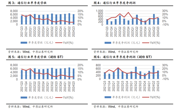 通信行业(以中信一级行业分类为基准)121家上市公司2024年前三季度合计实现营收19239.83亿元,同比增长3.9%,归母净利润1748.4亿元,同比增长8.2%。剔除ST,2024年前三季度,营收为19123.2亿元,同比增长4.1%,归母净利润为1754.5亿元,同比增长8.0%。受下游客户招标采购和执行节奏影响,以及节假日影响,通信行业收入与利润存在季节变动,同比数据可以减少季节性因素的影响。