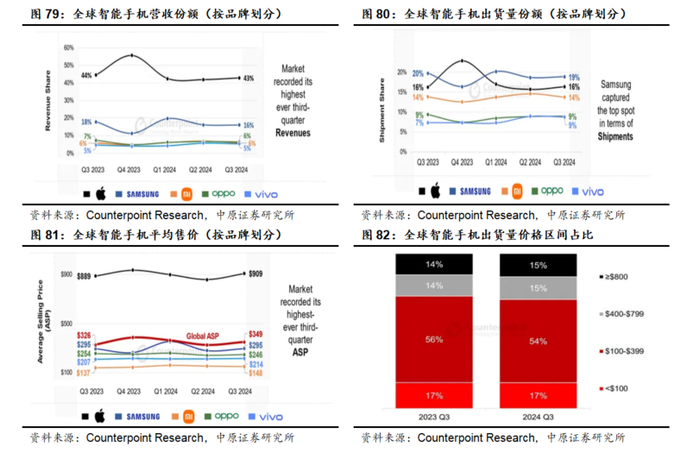 苹果在智能手机营收方面领跑市场,占据43%的份额,并创下了第三季度收入、出货量和平均售价历史最高纪录。2024Q3,三星的收入和出货量同比下降 2%,主要由于印度和拉丁美洲地区的下滑;小米的收入增长超过其出货量的增长,主要原因是以小米14系列为主的高端设备比例增加;vivo在前五大手机品牌厂商中增长最快,Q3在中国和印度出货量排第一;OPPO出货量和收入在同比下降,全球销售额在9月恢复同比增长,其中拉丁美洲和亚太其他地区贡献主要增量。