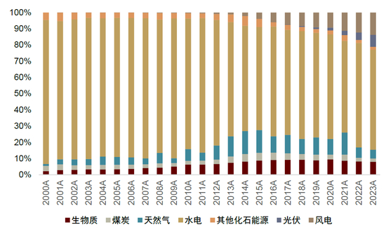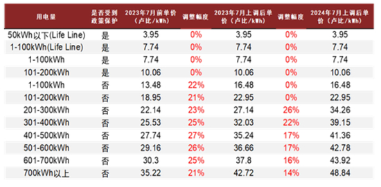 尼日利亚:化石能源丰富,但电网线损率高,电价补贴难以为继,推动离并网光储快速发展。尼日利亚地处西非东南部,人口超2.2亿,是非洲第一人口大国。从经济角度看,尼日利亚2023年GDP为3749亿美元,人均GDP为1690美元,但通货膨胀率较高 ,自2023年5月取消燃油补贴 ,实行统一汇率等政策后,其物价上涨、通货膨胀及货币贬值加剧,政府赤字情况严重。从发电侧看,尼日利亚自然资源丰富,是非洲第一大石油出口国,目前在已探明和可能的天然气储量规模方面排名全球第 9 位 ,2023年尼日利亚天然气发电量占比为80%,水电占比20%。从电价角度看,根据NERC ,尼日利亚终端电费为非洲各国最低,主要系丰富的自然资源及终端较多补贴所致。但我们认为未来尼日利亚具备较强的分布式光储放量预期:一方面,政府对终端电价的高补贴较少发放,使得发电机组运营较差,停电事故频发,与此同时,用户偷电漏电情况严重,反复的三角债使得正常供电难以延续。另一方面,赤字及经济问题使得政府难以持续维持补贴,电费上涨成为最终解决方式,尼日利亚当局于2024年4月3日宣布,部分消费者的电费将提高近 300% 。