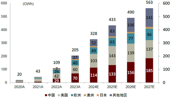 图表22:全球储能分地区出货量预估(不含通信储能)