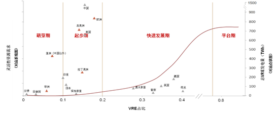 ►萌芽期(VRE占比≤10%):风光发电量对系统影响较小,系统存量灵活性资源充足,对新增储能需求较小。