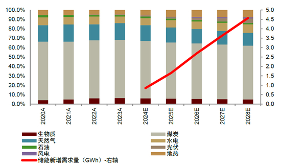 印度尼西亚:煤炭资源丰富,工商业发展驱动光储需求。从发电能源结构上看,印尼能源结构高度依赖化石能源,2023年煤炭发电占比为61.8%,天然气占比为17.7%,水电发电占比为7.0%,风光发电合计占比不足1.0%。印尼煤炭资源丰富。印尼能矿部2021年数据显示,其煤炭储量达388.4亿吨,预计能维持至少60年开采。而根据电力供应业务计划 (RUPTL)[4],2021—2030年,印尼计划新增光伏4.68GW、风能与储能电站1.49GW,我们认为风光发展政策力度有限,另外,较低的电力市场化程度也使得目前缺乏合适的风光发展及配储定价机制。但近年印尼经济发展及产业投资持续增多,如中国印尼综合产业园区青山园区,位于印尼中苏拉威西省,远离主要人口聚集地。印尼岛屿多达1.7万个,电网兴建较为困难使得诸多产业园区选择采用光储进行供电,在此背景下,我们认为未来印尼分布式离网光储需求将不断增长,预计光伏发电及装机将超过政策规划。我们假设在2023年至2028年期间,印尼的电力需求将以每年5%的速度增长,预计2028年光伏及风电发电比例将升至4.7%及1.4%,2024-2028年新增储能装机约为13.4GWh。