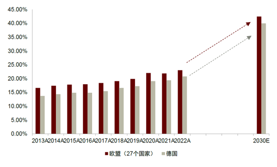 中长期看,欧盟提升可再生能源占比规划,催化中长期储能需求。为减少俄罗斯化石燃料的使用,欧盟2023年10月修订的可再生能源指令EU/2023/2413 将欧盟2030年可再生能源消费比例目标从之前的 32%提高到最低42.5%,并希望达到45%。在多个欧盟国家,可再生能源部署的速度进一步加快,上网容量超过之前预期,又修订提升相关目标,使得许多成员国预计将在更晚的时候实现相关规划。可再生能源目标或将保障欧洲中长期储能需求。