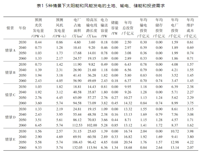 研究表明,中国实现碳中和需要在2020—2060年间将太阳能和风能年发电量从1PW·h增加到约10~15PW·h。为了实现这一目标,可再生能源的增长速率需要提升到过去10年的2~3倍,但太阳能和风能发电会受到地形、风速、风向、光辐射、大气云量、降雨等多种自然要素的影响,本研究组结合最新的能源调度模型,预测了2020—2060年间可建造光伏和风力电厂的发电量,并预估了在图2中提出的5种情景下开发太阳能和风能带来的土地、输电、储能、投资等需求(表1)。
