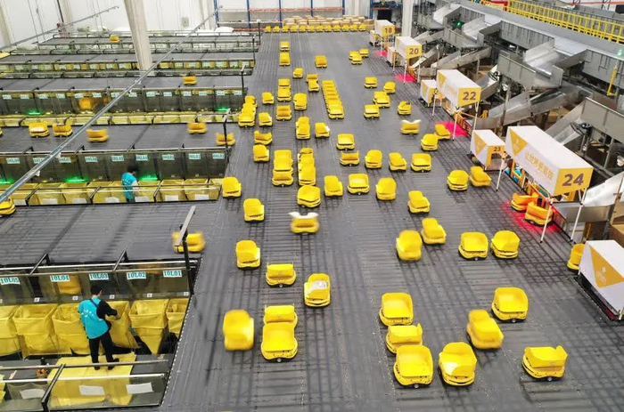 中国将推动物流数智化发展。图为浙江省德清县一家服饰公司的华东物流中心内,800余台分拣“小黄人”机器人在精准配送各类服饰。新华社倪立芳 摄