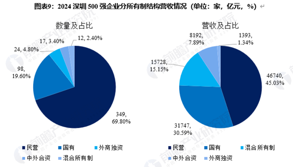 从《报告》呈现的数据来看,民营企业无疑是深圳500强中的中坚力量。新上榜企业里,民营企业数量多达75家,远超国有企业的23家和中外合资企业的3家。从整体榜单占比而言,占比69.80%的民营企业实现营收46740亿元,营收占比达45.03%,与国有企业合计占据榜单447个席位,贡献了约 76%的营收规模,足见其重要性。