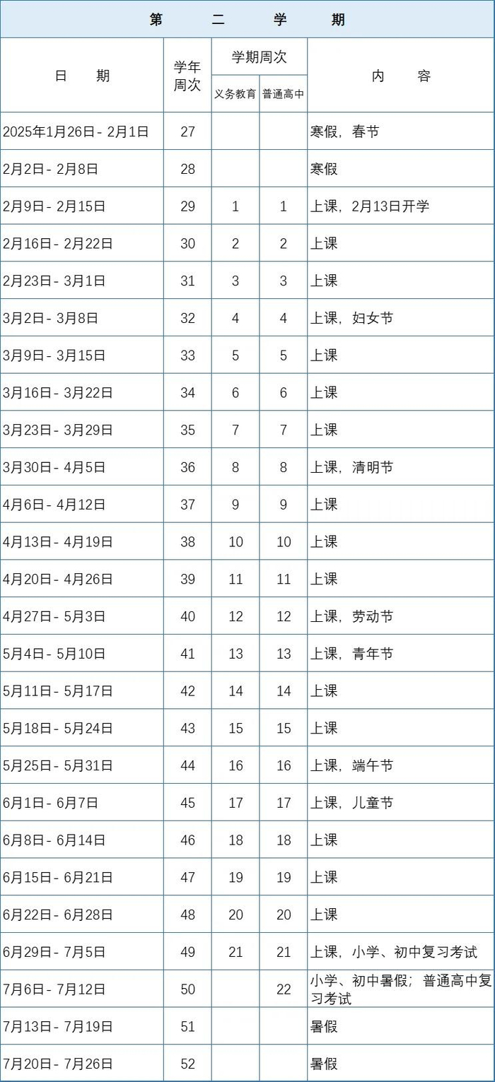 北京市、天津市义务教育阶段从2025年1月12日至2月16日放寒假,共5周零1天。非义务教育阶段:从2025年1月19日至2月16日放寒假,共4周零1天。