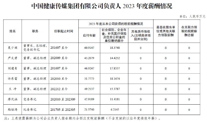 中国健康传媒集团有限公司负责人2023年度薪酬情况