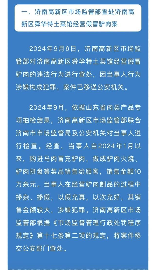 该案例具体查处过程为:2024年9月,依据山东省肉类产品专项抽检结果,济南高新区市场监管部联合济南市市场监管局及公安机关对济南高新区舜华特土菜馆进行检查。经查,该菜馆自2024年1月以来,购进马肉冒充驴肉,做成驴肉火烧、驴肉拼盘等菜品销售给顾客,销售金额10万余元。菜馆经营者在经营驴肉制品的过程中掺杂、掺假,以假充真,以次充好,其销售金额较大,涉嫌犯罪。济南高新区市场监管部根据《市场监督管理行政处罚程序规定》第十七条第二项的规定,将案件移交公安部门查处。