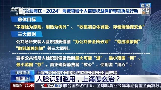 上海市委网信办网络执法监督处副处长 吴宏鸣:通过调研了解,在上海一些消费领域,人脸识别技术存在滥用的现象,所谓滥用就是随意地或者是不合规地使用人脸识别技术,收集消费者的人脸敏感信息,根据《个人信息保护法》相关的规定要求,人脸生物信息属于敏感个人信息,要受特殊的保护,针对这种现象,我们展开了相应综合整治的行动。