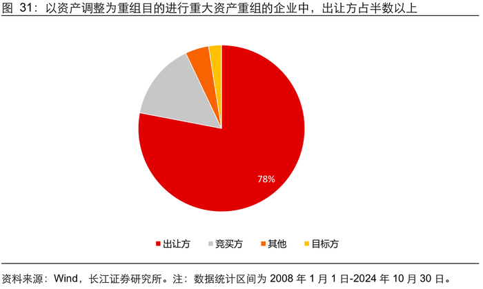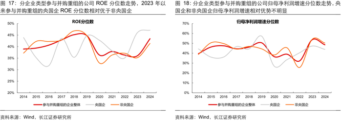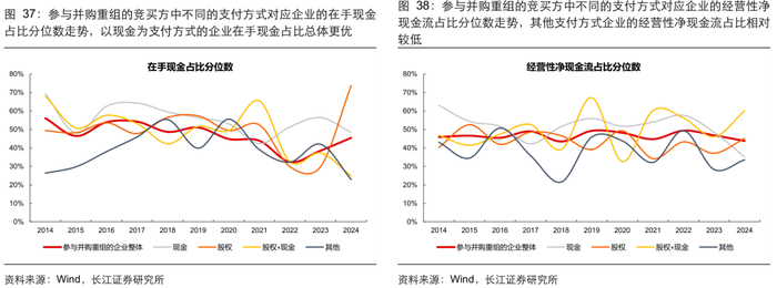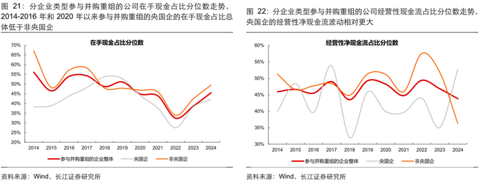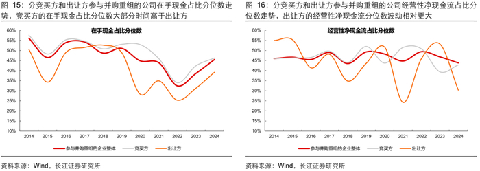 分参与方类型 :参与并购重组的竞买方盈利能力总体优于出让方。1)从盈利能力看,参与并购重组的竞买方 ROE 的稳定性相对更好,分央国企看,2014-2016 年的并购重组周期,参与重组的非央国企 ROE 水平总体优于央国企,但 2023 年以来相对优势出现变化;2)从现金流质量看,参与重组的竞买方现金流相对更稳定,账面现金相对更充裕。