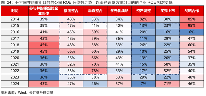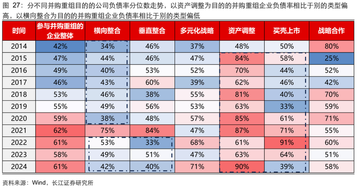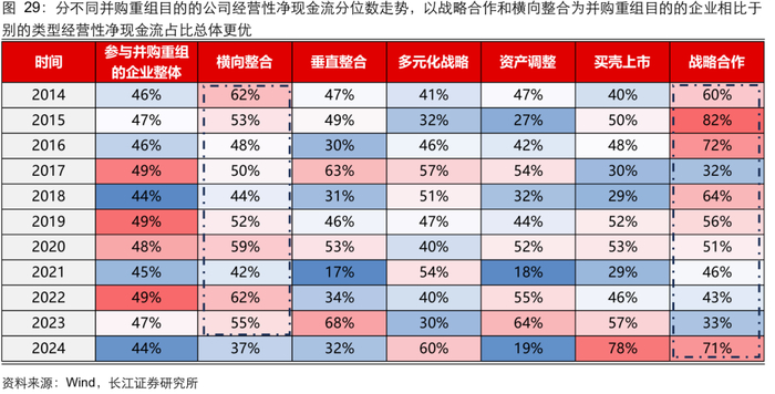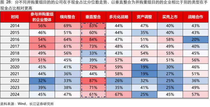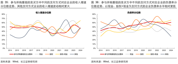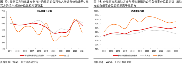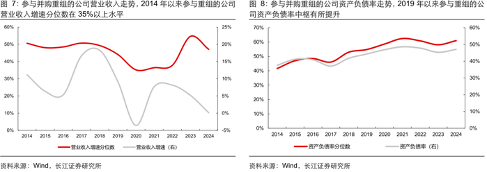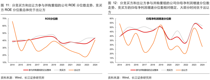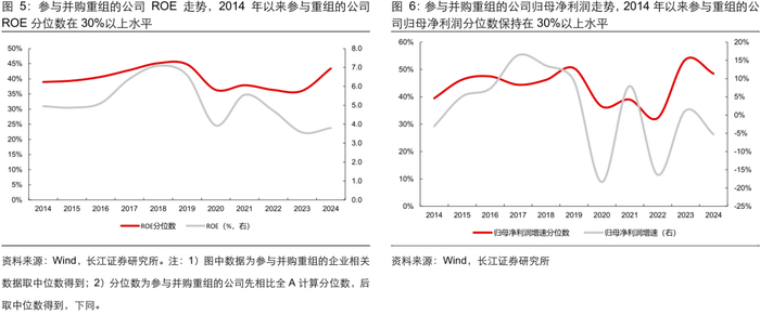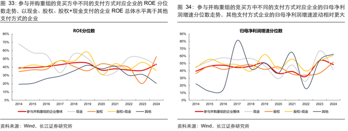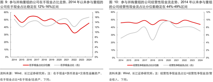 总体看:参与并购重组的企业盈利能力相比全 A 不算突出。复盘历史参与并购重组企业的财务表现,按照重大资产重组首次披露的时间计算,我们统计了披露重大资产重组公告的企业最新能够获取的财务数据情况。1)从盈利能力看,2014 年以来参与重组的企业 ROE 分位数在 30%-50%区间;2)从现金流质量看,2014 年以来参与重组的企业在手现金占比稳定在 12%-16%区间,分位数位于全 A 的 50%左右,历史参与并购重组的企业整体盈利和现金状况不算突出。