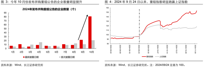 2024 年以来,有关上市公司并购重组的政策陆续出台,鼓励央国企等加快并购重组。新“国九条”和“科八条”均指出要支持并购重组;2024 年 9 月 24 日,证监会发布《关于深化上市公司并购重组市场改革的意见》,简称“并购六条”,指出要支持科创板、创业板上市公司并购产业链上下游资产,支持运作规范的上市公司围绕产业转型升级、寻求第二增长曲线等需求开展符合商业逻辑的跨行业并购等,政策再提支持市场并购重组,《意见》发布后,10 月份发布并购重组公告的公司数量明显提升。我们本篇报告作为并购重组类型报告的第二篇,将重点分析。历史并购重组企业的盈利能力和现金流状况,总结其财务特征,寻找未来可能进行重组的方向。