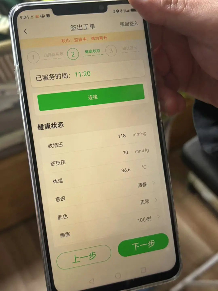 服务正式开始前,张世莲为刘秀珍测量了血压、血氧、体温与心率,仪器通过蓝牙连接能够将具体数据实时传输至App,后续还将同步至“长护险智能监管和智能为老服务”平台。静安区医保局工作人员邓又佳介绍,该平台于2021年正式落地静安,与“照护365康护端”App关联,设置“轨迹定位追踪、人脸识别打卡、语音唤醒识别、计时播报提醒、异常一键报警”功能,实时展现长护险工单的流转全过程,从申请、审核到服务执行,每一步都清晰可见,确保服务的规范性和高效性。