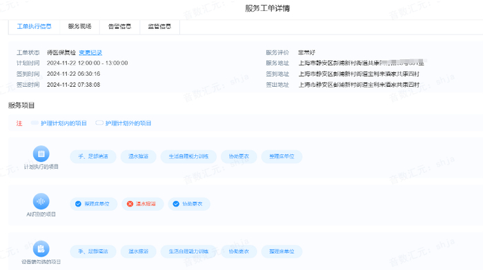 “长护险智能监管和智能为老服务”平台推动了长护险服务向更加规范化、标准化的方向发展,也将管理的触角进一步延伸。邓又佳告诉记者,在静安区引入的25家康养机构里,不乏许多管理程序尚不完善的小型机构。平台应用后,不仅大幅减少了人工监管和审核成本,还让管理能力欠缺的康养机构以低成本达到与大型康养机构一样的管理水平,“一年约400万小时的服务时长,各康养机构只需支付40万元的运维和流量费用,相当于每个工单的管理成本仅需几分钱”。