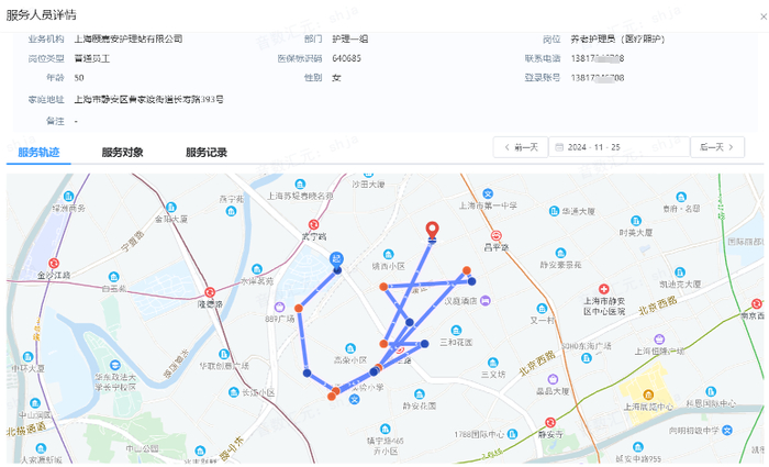 同一时间,“照护365康护端”App开启后台实时录音,福寿康静彭护理站护理员主管胡天丽也在“长护险智能监管和智能为老服务”平台上,实时监测到了张世莲的轨迹与服务状态。