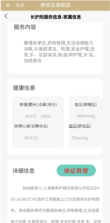 早上,静安区唐家沙小区居民张晔打开手机,进入随申办静安旗舰店的“为老服务”板块,发现母亲刘秀珍前一日享受长期护理保险(简称长护险)服务的具体内容与测量的血压、血氧、体温与心率等生命体征指标一目了然。