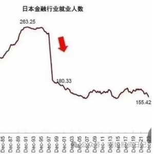 90年开始,日本经济泡沫开始破裂。根据下图的数据看,日本金融从业人员从95年开始断崖减少。最终从业人员比起高峰期减少几乎一半。