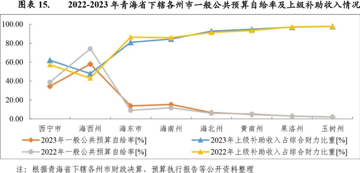 从下辖各州市情况看,2023年,受支柱行业工业品价格周期影响,海西州税收收入规模下降,一般公共预算收入同比下降8.6%至129.72亿元,西宁市一般公共预算收入同比增长9.4%至144.09亿元,规模重新回归全省首位。其余州市与上述两州市收入差距仍显著,其中经济排名相对靠前的海东市通过盘活、处置存量资产形成超收收入,成为当年全省一般公共预算收入增幅最大的州市,增速达74.9%;海南州受益于经济恢复性增长和补缴往年部分税款,一般公共预算收入同比增长23.1%。其余四州市收入规模均不足10亿元。青海省各州市一般公共预算收支平衡对上级补助收入依赖度均很高,除海西州和西宁市外,其余州市一般公共预算自给率均未超过16%,且2023年部分州市收支矛盾进一步加大。2024年上半年度,仅获取到四州市财政收支相关数据,其中西宁市受上年同期一次性税收入库抬高基数、工业品价格回落等因素影响,税收收入大幅下降,一般公共预算收入增收承压。