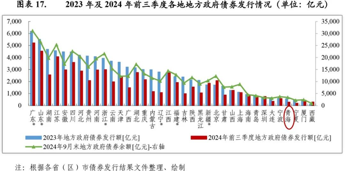 2023年及2024年前三季度,青海省分别发行地方政府债券569.78亿元和291.26亿元,发行规模在全国排名靠后;其中2023年新增债券和再融资债券发行额分别为208.79亿元和360.99亿元;全年债务还本支出合计372.88亿元,付息支出105.53亿元。截至2024年9月末,青海省地方政府债券存量余额为3416.28亿元。