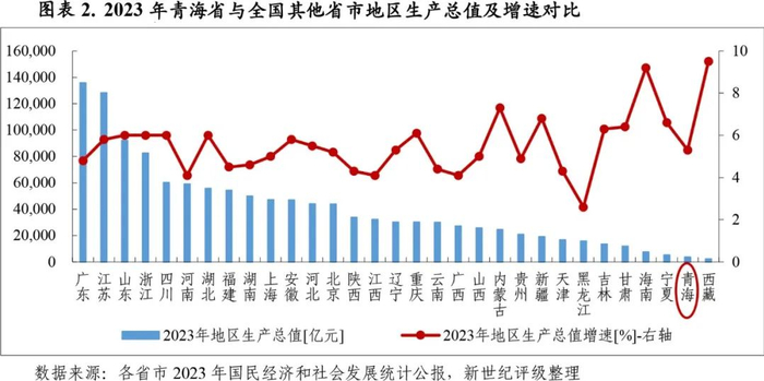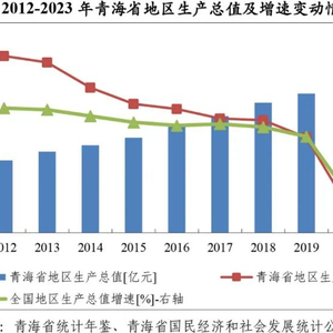 青海省矿产资源、水资源及新能源等资源蕴藏丰富,全省在生态保护的前提下积极发展循环产业、清洁能源、战略性新兴产业,已形成资源依托型产业体系,且独特的自然人文景观为区域旅游业发展提供了良好的条件,同时随着“一带一路”倡议,以及新时代西部大开发、黄河流域生态保护和高质量发展、乡村振兴、东西部协作、对口支援和兰西城市群建设等重大战略的实施,区域经济保持发展;但受限于高原山地、气候寒冷为主的自然条件及脆弱的生态环境,区域可供开发土地面积有限,且劳动力资源不足、产业链条处于中低端且生态资源价值转化支撑有限,总体经济发展水平仍相对滞后。2023年,全省经济较快复苏,全年全省实现地区生产总值3799.06亿元,继续居全国各省市第30位,仅超西藏自治区;同比增长5.3%,增速分别高于上年和全国水平3.0个百分点和0.1个百分点,经济增速排名由上年的第22位升至第17位;同年,全省人均地区生产总值6.39万元,是人均国内生产总值的0.72倍;城镇居民人均可支配收入40408元,同比增长4.3%,收入规模远低于全国平均水平(51821元)。
