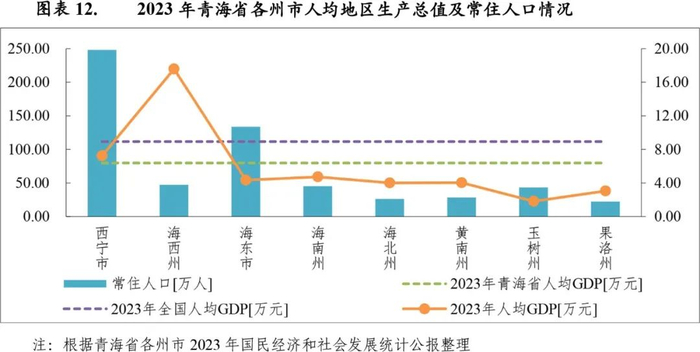 青海省人口集中分布在居住环境相对较好的西宁市和海东市,2023年末,西宁市和海东市常住人口分别为248.1万人和133.8万人,分别较第七次普查常住人口增加1.3万人和减少2.0万人,合计占全省常住人口总数的比重为64.3%,其他地区人口分布较分散,常住人口均未超50万人。从人均地区生产总值来看,2023年全省仅海西州和西宁市人均地区生产总值高于全省平均水平,其中工业型城市海西州地广人稀,人均地区生产总值约为17.6万元;西宁市人均地区生产总值为7.3万元,仅为全国人均地区生产总值的0.81倍。其他州市人均地区生产总值均低于5万元,其中玉树州和果洛州与全省平均水平差距相对显著,2023年人均地区生产总值分别以1.8万元和3.0万元居于末两位。