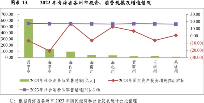 青海省各州市经济发展水平受自然地理条件、资源禀赋差异及环境承载能力等影响分化显著,省会西宁市经济首位度高,辐射带动能力有待提升。2023年,西宁市经济总量仍保持领先地位;柴达木地区的海西州和处于东部城市群的海东市经济总量次之,其中海西州地域辽阔、资源富集,工业经济占绝对比重,人均指标显著领先于其他州市,但受煤化工和盐湖化工等行业周期性影响,2023年全州经济总量仅较上年持平;其余州市区域开发受生态保护限制程度高,经济发展水平落后。从经济增速看,除海西州外,2023年其余各州市经济均呈较快恢复态势。从三大需求看,近年来各州市普遍面临投资增长动能和消费需求不足等压力,且对外开放程度不高。2024年上半年度,受规模以上工业水电及光伏发电行业强力拉动,海南州经济增速亮眼;果洛州第二产业下行压力加剧,增速转负;其余各州市经济运行相对平稳。