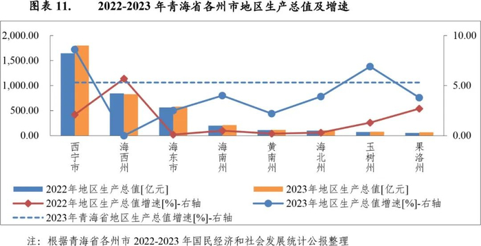受自然地理条件、资源禀赋差异及环境承载能力等影响,青海省地区经济发展水平极不均衡。东部地区的中心城市、省会西宁市首位度高,综合实力明显强于其他州市,柴达木地区的海西州、东部地区的海东市经济发展水平保持相对领先位次。其他州市平均海拔均在3000米以上,适宜开发、生活、生产的空间相对有限,地广人稀,经济总量小,经济发展水平落后。2023年,除海西州外,全省下辖各州市经济总量保持增长,且经济增速均有所提升。