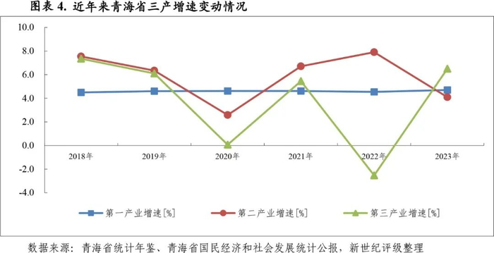从经济增速看,除海西州外,2023年青海省下辖其他州市经济增速均有所提升,但仅西宁市和玉树州经济增速高于全省平均水平。具体来看,作为全省的政治、经济、文化、科技和交通中心,西宁市经济结构及产业转型升级步伐领先于其他州市,2023年第三产业突破千亿元,同时新动能持续增长,当年规模以上工业增加值增长22.9%,其中光伏、钮电、特色化工和合金新材料三大优势产业集群完成工业总产值同比增长3.3%,占全市规上工业总产值的比重为78.6%;上述因素综合影响下,当年全市经济增速为8.6%,较上年提升6.5个百分点,居全省首位。海西州是青海省区域面积最大的民族自治州,依托柴达木盆地资源禀赋,以盐湖化工、油气化工、有色冶金、特色生物、新能源开发等为主导的循环经济特色产业体系初步成形,工业对其经济发展拉动显著,2023年第二产业增加值占比达66%;近年来以电池级碳酸锂为代表的战略性新兴产业、新材料、新能源、装备制造产业推动其区域经济保持较好发展态势,同时支柱产业周期性强,2023年受煤化工和盐湖化工等行业周期性影响,全州经济总量较上年持平,增速回落5.7个百分点,经济增速排名全省末位。位于河湟谷地的海东市自然条件较优,是全省人口及产业集中地之一,农业基础及交通优势较突出,已逐步形成二、三产业协同拉动经济发展的格局,但其金属冶炼、建筑材料等传统优势产业受黄河流域生态保护限制较大,产业转型升级承压,2023年规模以上工业增加值同比下降10.6%,当年经济增速仅2.5%。经济总量排序次之的海南州、黄南州和海北州经济增速位于2.2%-4.0%区间,三者农业经济占比均相对较高,均处于30%左右;其中位于三江源区域的海南、黄南两州工业经济发展显著依赖水电、光伏等清洁能源,海北州产业体系以资源初开采为主,服务业占据主导地位,但受限于内部需求,对经济增长拉动作用有限。此外,经济排名末两位的玉树州和果洛州经济增速分别为6.9%和3.8%;玉树州是全省主要畜牧业产品基地,产业发展以畜牧业为主导,第一产业增加值占比在60%左右,两州市经济发展基础薄弱,增长动能不足。