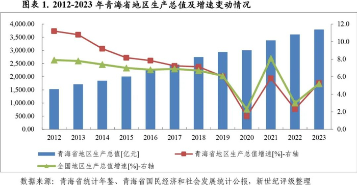 青海省位于我国西部、青藏高原东北部,是稳藏固疆的战略要地,同时作为长江、黄河、澜沧江三江发源地,也是国家重要水源地及生态安全屏障。境内盐湖资源、矿产资源、水资源及新能源资源蕴藏丰富。近年来,青海省在生态保护的前提下积极发展循环产业、清洁能源、战略性新兴产业,已形成资源依托型产业体系,且随着生态旅游资源的开发及服务业配套设施的逐步完善,旅游业发展提速,二、三产业双核驱动带动全省经济保持发展;但受制于高原山地为主的地形条件和脆弱的生态环境,区域可供开发土地面积及资源价值转化支撑仍较为有限,经济发展水平相对落后。2023年,全省实现地区生产总值3799.06亿元,继续居全国各省市第30位,仅超西藏自治区;同年,青海省文旅产业明显回暖,高技术产业投资拉动作用凸显,带动经济强劲复苏,当年实现旅游总收入430.64亿元,较上年增长2.0倍,高技术制造业增加值增长62.2%,占规模以上工业增加值的26.1%;经济增速为5.3%,分别高于上年和全国水平3.0个和0.1个百分点。2024年前三季度,青海省经济低速增长,实现地区生产总值2741.19亿元,同比增长2.5%,当期投资增长动能和消费需求不足,固定资产投资和消费增速分别为0.7%和-3.1%。