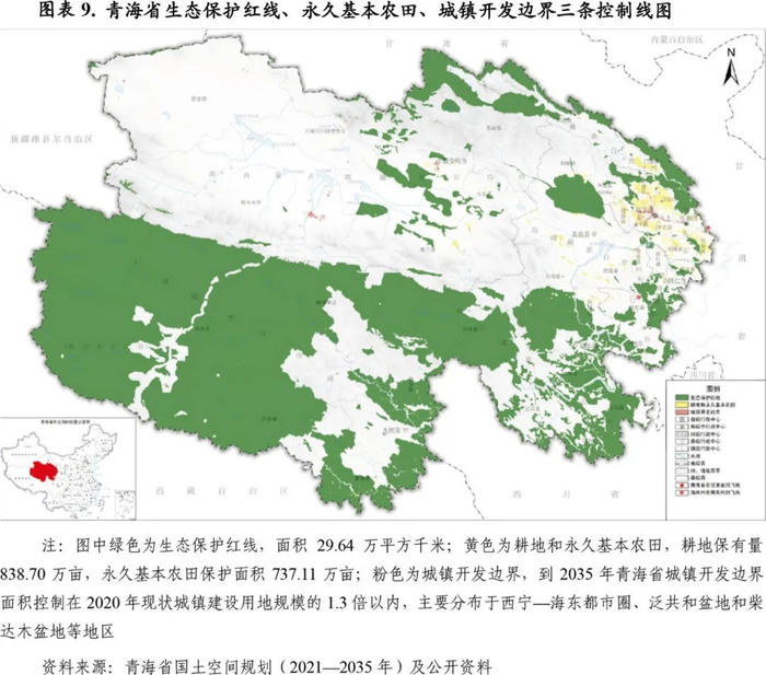 青海省位于我国西部、青藏高原东北部,因境内有国内最大的内陆咸水湖——青海湖而得名,自东以逆时针方向起依次与甘肃、新疆、西藏和四川接壤,是稳藏固疆的战略要地;青海也是长江、黄河、澜沧江三江的发源地,素有“中华水塔”之称,是国家重要的生态安全屏障。全省总面积72万平方公里,占全国总面积的十三分之一,仅次于新疆、西藏及内蒙古,省域辽阔但地貌复杂,五分之四以上的地区为高原,全省平均海拔3000米以上,呈现“一分台地、三分平原、六分山地”的总体特征,在保障生态安全和粮食安全的前提下,总体适宜工业化城市化开发的国土空间较为有限。此外,青海省地广人稀,2023年末全省常住人口为594万人,较2022年末减少1万人,占全国总人口的比重为0.4%;人口密度约8人/平方公里。青海省也是我国多民族聚居的地区之一,境内有藏族、回族、土族、撒拉族和蒙古族等,少数民族人口约占全省常住人口的一半。