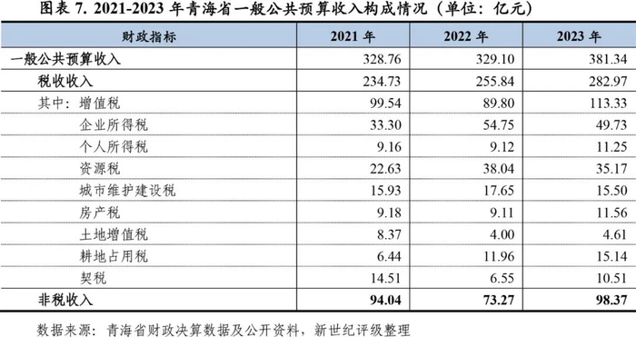 受制于地区经济发展水平相对落后,青海省一般公共预算收入在全国排名仍靠后,2023年继续居全国各省市第30位,仅超西藏自治区。当年,受经济恢复性增长、2022年实施大规模留抵退税拉低基数、盘活国有资产资源等因素影响,全省实现一般公共预算收入381.34亿元,同比增长15.9%,预算执行率为110.3%;同年,实现税收收入282.97亿元,同比增长10.6%,占当年一般公共预算收入的比重为74.2%,较上年回落3.5个百分点。从税源结构看,2023年全省前四大税种为增值税、企业所得税、资源税及城市维护建设税,分别实现收入113.33亿元、49.73亿元、35.17亿元和15.50亿元,此外耕地占用税、契税等一次性税收收入增长较快,当年分别为15.14亿元和10.51亿元。依托于区域资源禀赋,青海省非税收入以国有资源(资产)有偿使用收入为主,2023年全省非税收入为98.37亿元,同比增长34.3%,主要系盘活国有资产资源,国有资源(资产)有偿使用收入增收20.87亿元所致。