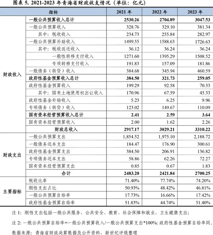 受制于地区经济发展水平相对落后,青海省一般公共预算收入规模在全国排名靠后。受经济恢复性增长、上年实施大规模留抵退税拉低基数、盘活国有资产资源等因素影响,2023年全省一般公共预算收入快速增长,但一次性收入较多,稳定性较弱。青海省一般公共预算自给率仍很低,财政平衡高度依赖于持续大额的上级转移支付收入。由于土地市场需求不足,青海省政府性基金预算收入对地方财力的贡献度有限,且当年土地成交继续缩量,政府性基金预算收入大幅下滑。2024年前三季度,青海省一般公共预算收入同比下降4.9%;由于市场有效需求不足,主要工业品价格仍存在回落压力,且房地产市场持续低迷,税收增收压力仍较大。