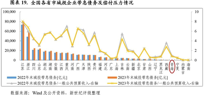 由于部分已发行债券均已到期兑付的城投企业带息债务数据无法获取,从Wind有存续债券的城投企业带息债务看,截至2024年9月末青海省城投债存续企业2023年末带息债务合计298.88亿元,居全国31个省市中降序排列第28位,带息债务余额是其2023年青海省一般公共预算收入的0.78倍,位列全国31个省市降序排名第22位。从分布情况看,青海省城投企业带息债务均集中在西宁市级城投企业,2024年9月末西宁市城投债存续企业2023年末带息债务余额是其2023年一般公共预算收入的2.07倍,债务偿付压力仍相对较大。