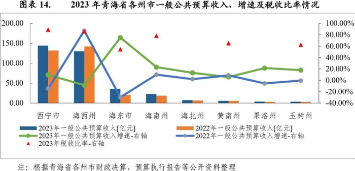 2024年上半年度,未获取到海西州、海东市、黄南州和玉树州财政收支相关数据,其余州市中海南州和海北州一般公共预算收入同比分别增长9.0%和10.4%;果洛州一般公共预算收入同比下降6.8%;西宁市一般公共预算收入同比下降17.2%,主要受上年同期一次性税收入库抬高基数、工业品价格回落等因素影响,税收收入同比下降21.3%。