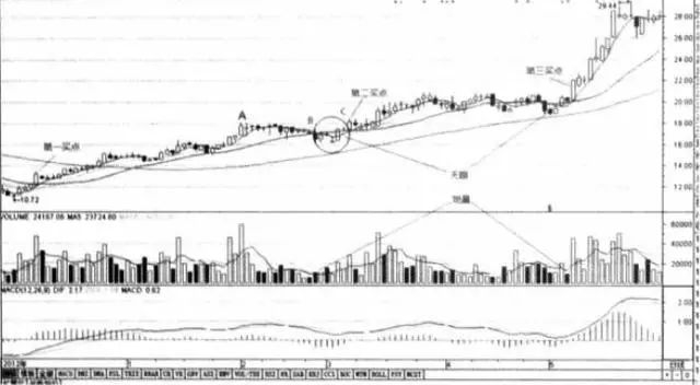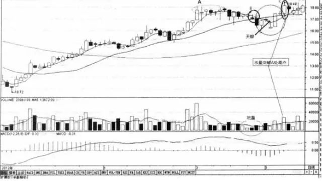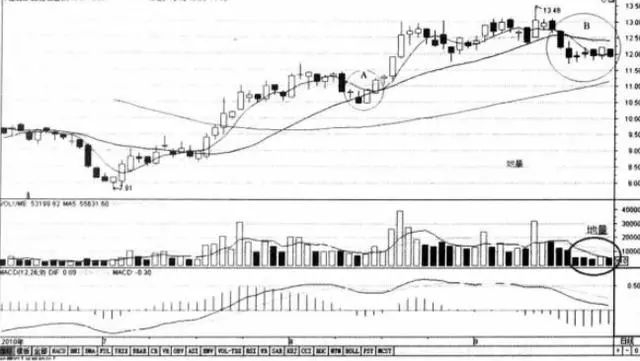 如图,在2010年7月初见底以来,价格一路攀升,到图中A处出现了天眼地量。此时的特点是: