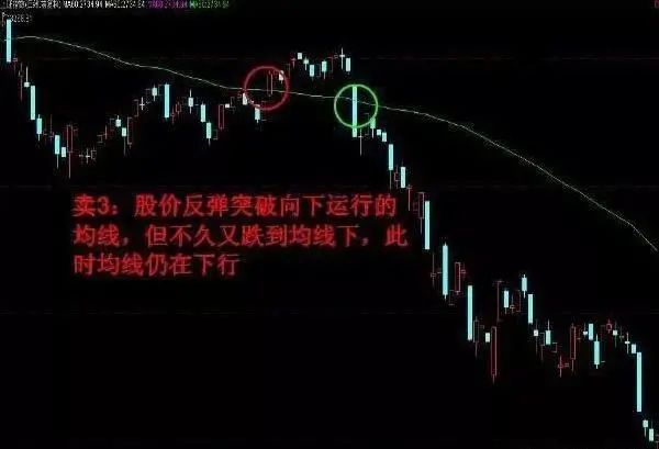 上图b的位置, 价格跌落向下运行的均线下方,然后向均线弹升 ,但未突破均线,即受阻回落——卖出