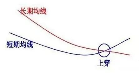 上穿:长期均线方向向下,短期均线向上交叉长期均线