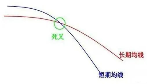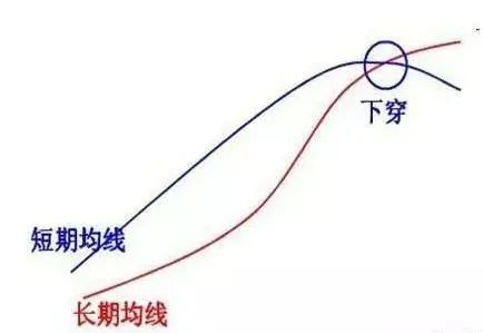 死叉:长期均线方向向下,短期均线下穿长期均线形成死叉