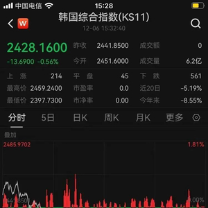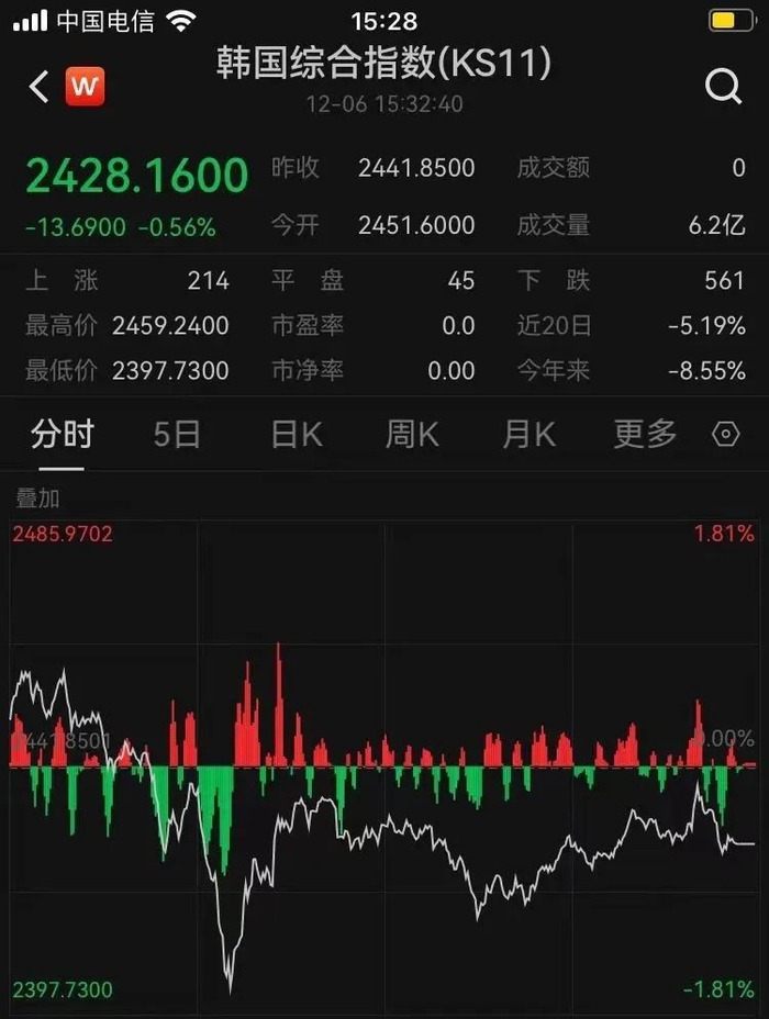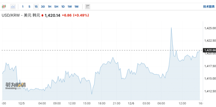 市场方面。12月6日早盘,韩国资本市场在盘中再度杀跌,韩国综合指数直线跳水,跌幅一度达到1.8%,此后又迅速回弹,最终跌幅收窄至0.56%。