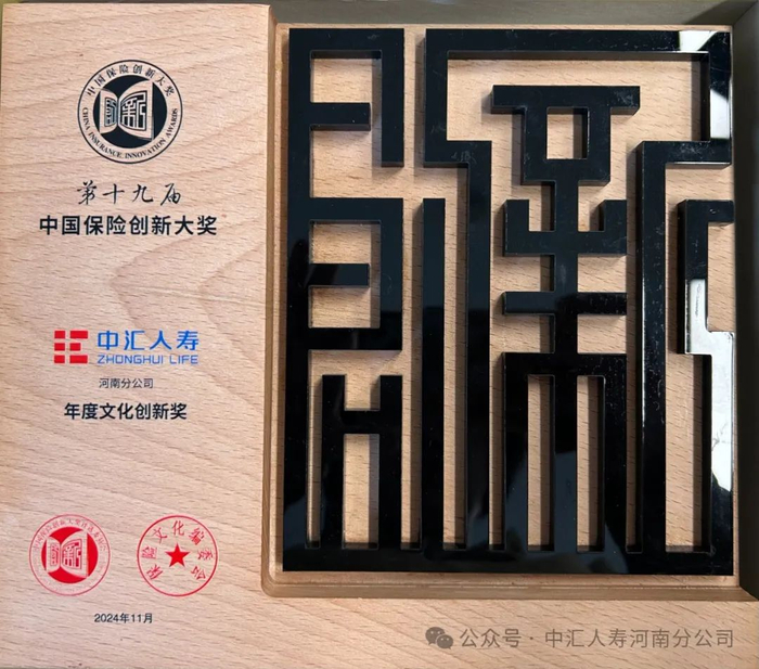 2024年11月,由《保险文化》杂志主办的2024年第十九届中国保险创新大奖评选结果揭晓。经过评委会专家评审,中汇人寿河南分公司荣获“年度文化创新奖”。据悉,中国保险创新大奖迄今已成功举办十九届,是保险业内深具影响力的评选活动。